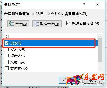 用excel刪除重復(fù)值,選擇“搜索詞”作為刪除條件,只要搜索詞是一樣的我們就認(rèn)為它是同一個(gè)詞,最后保留了41400個(gè)詞。