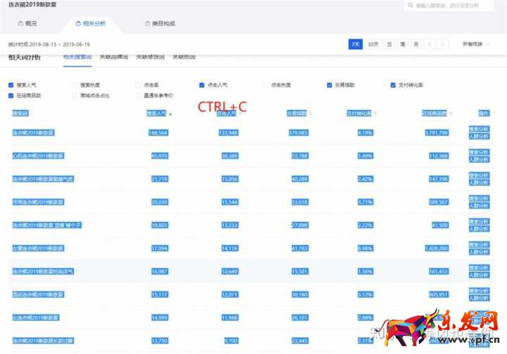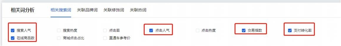 在這個(gè)相關(guān)分析里面記得一定要選這五項(xiàng):搜索人氣、點(diǎn)擊人氣、交易指數(shù)、支付轉(zhuǎn)化率、在線(xiàn)商品數(shù)。