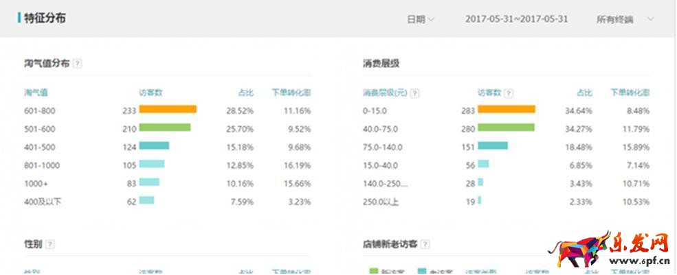 通過上圖的特征分布,結合訪客對比,我們可以很好的知道我們店鋪的人群畫像。知道了我們客戶的人群畫像,我們也就能對我們的店鋪、主圖、詳情頁進行針對性的優化。這樣對于轉化率的提高有很大幫助。