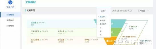 交易概況包括交易總覽和交易趨勢兩部分。我們首先看交易概況,其中日期我們可以選最近一天,最近7天,最近30天及單日、單周、單月的平均數(shù)據(jù)。大家看下圖,每個數(shù)值都會和進(jìn)7天的數(shù)據(jù)有比較。我們從中可以看到我們成交額的變化。