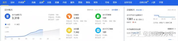 打開生意參謀就是這個界面,這個板塊可以看到店鋪實時的支付金額,訪客數、支付買家數等,新手商家一般都是只看看這些數據。我們在日常運營店鋪的過程中,除了關注店鋪的這些實時數據之外,這個板塊里我們還需要注意的是右邊的店鋪層級問題,店鋪層級是根據店鋪近30天的成交金額來計算的。如果店鋪層級掉了,我們就需要找到具體的原因分析問題所在。既然店鋪的層級與店鋪的支付金額有關,我們可以分析店鋪的轉化率等數據,那么我們就往下繼續看。
