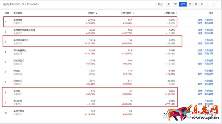 4:最后我們看到店鋪手淘猜你喜歡的流量轉化處于下降狀態,通過端口情況可知道,店鋪現在在超級推薦的推廣上應該是停滯狀態。排名前十的端口看不到此端口,但是目前的淘寶商家應該都很清楚,超級推薦是目前很重要的一個端口。