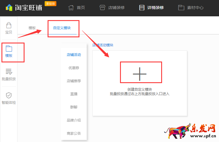 然后,就可以看到關(guān)于在寶貝詳情頁中添加自定義模塊的入口,點擊【+】按鈕