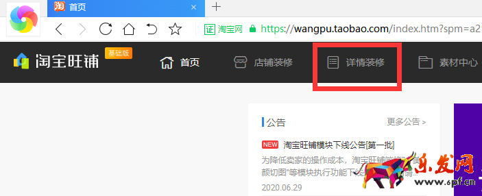 首先,打開官方淘寶旺鋪界面,找到并點擊進入【詳情裝修】欄目