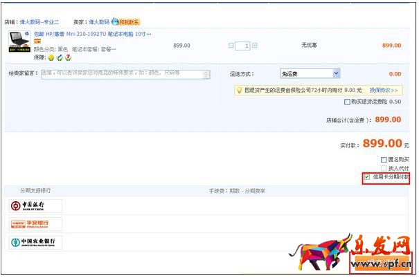 招商銀行中國銀行淘寶分期付款手續費:3期3.9%,6期4.9%,12期6.5%;
