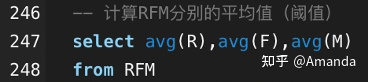 (2)為了劃分R、F、M值的高 與低,這里采用常用的平均值法作為閾值(也可采用通過業務經驗自定義閾值的方法)查詢語句如下: