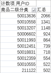 第二步:2萬余名的用戶中使用商品最多的是“12310741985”號(hào)商品,一類商品中“50008168”用戶使用最多,二類商品中“50013636”用戶使用最多