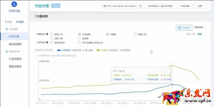 我們打開生意參謀→市場(chǎng)行情→行業(yè)洞察→行業(yè)大盤→勾選訪客數(shù)和交易指數(shù)