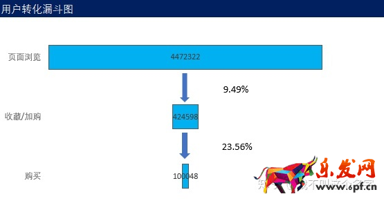 從上圖可以看出,從瀏覽到有購買意向只有9%的轉化率。只有少量用戶是直接購買而未通過收藏和加入購物車,從頁面瀏覽到收藏/加購的轉化率偏低,該階段的轉化率應重點提升。