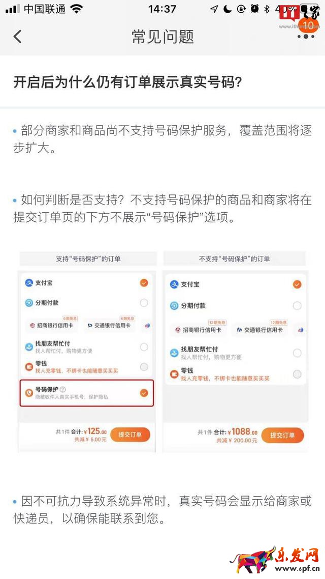 不支持號碼保護的商品和商家將在提貨訂單頁面下方不展示號碼保護選項。