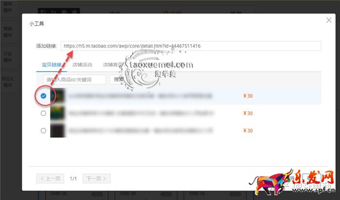 6、此時會彈出小工具界面,只需要選中寶貝或者其他鏈接,上面的【添加鏈接】文本框內自動生成手機端鏈接。注意:這里選擇的寶貝應該是關聯產品中的寶貝,