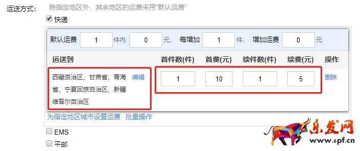 以上圖為例,小編設置的新疆、甘肅、寧夏、青海、西藏幾個地方的消費者買1件需要付10元運費,每增加1件則多付5元運費(買2件付15元運費)。在設置指定地區運費時,可以分別將偏遠地區、港澳臺地區、海外地區分別設置運費。