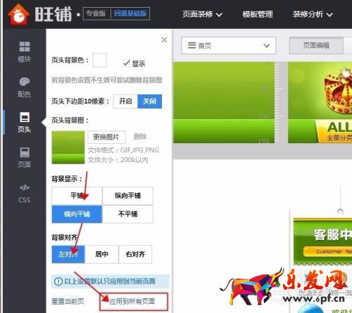 ?3 設(shè)置背景顯示選擇橫向平鋪,設(shè)置背景對齊選擇左對齊,最后記得點擊應(yīng)用到所有頁面。