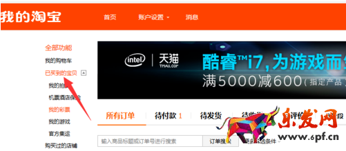 3、進(jìn)入我的淘寶后,點(diǎn)擊全部功能下已買的寶貝。如下圖所示會顯示,你購物全部的訂單,包括未付款,已付款等等訂單。