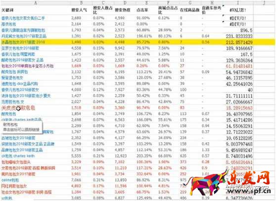 將帶有“香奈兒”“圣羅蘭”等帶有品牌或者知名明星的詞語排除掉,把搜索人氣與在線寶貝數比值大于5.搜索人氣大于1000的詞篩選出來。