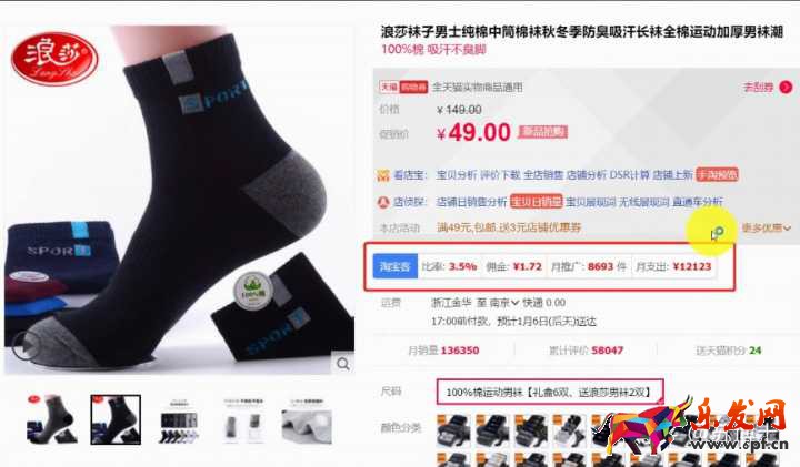 再一個就是淘寶客了,這個我們在無線端和PC端都看不到,要借助第三方插件才能看到,像下圖的這款襪子,我們就能夠很清晰的了解它的淘寶客推廣情況。
