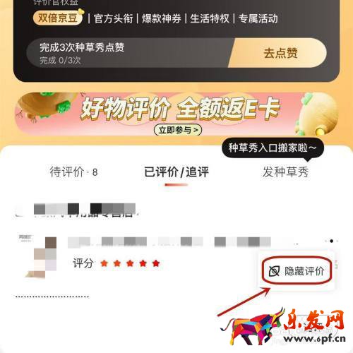 5 點擊隱藏評價 在【已評價追評】頁面中,點擊【隱藏評價】即可刪除錯的評價。