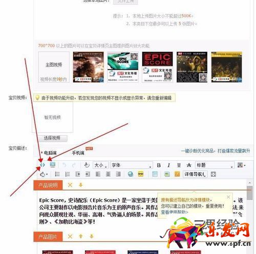 淘寶賣家都知道,淘寶視頻是收費收費服務,本分享給大家如何上傳視頻后可以不受淘寶收費限制,在詳情頁,主頁,自定義頁面上任意插入多條視頻,并實現播放窗口大小與自動播放控制。如有不清楚的請加我旺旺“貼貼酷吧”咨詢