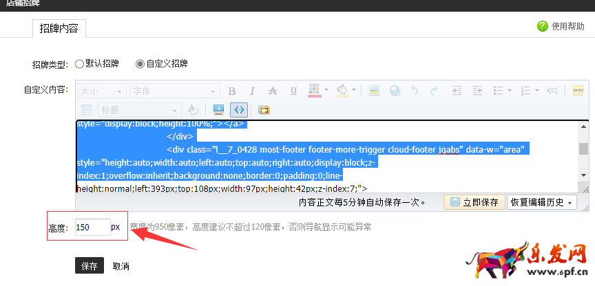 上圖是小編自己設計的店鋪的店招圖片。設計完成以后,我們選擇自定義招牌,不會代碼的小伙伴選擇圖片上傳,輸入店鋪空間的圖片鏈接即可哦。