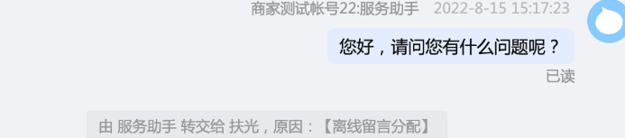 當自動分配給客服時,千牛的接待消息中會展示轉交的系統消息,并注明原因為「離線留言分配」。