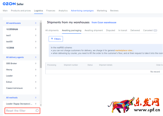 賣家需要重置篩選器,單擊“Reset filter”(重置篩選器)。重置后,系統將顯示所有倉庫、運輸方式和物流供應商,并且 “Awaiting packaging”(等備貨)一欄將被刷新。