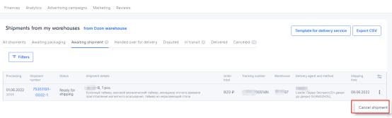 在 “All shipments”(所有包裹)或 “Awaiting packaging”(等待備貨)欄中,單擊→ “Cancel the shipment”(取消包裹),然后輸入取消原因。