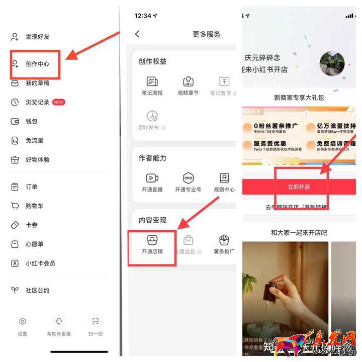 個人店:準備好身份證照片,準備一個全新的小紅書號就可以去開店鋪了,創作中心-更多服務-開通店鋪-個人店鋪。