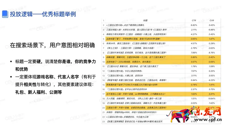 最后來看一下標題的優化,用戶的意圖在搜索中其實是很明確的,所以在標題里一定要包含游戲的名稱詞或者是說代言人的名字,明確地表示出來你是誰,你的產品是哪一款游戲,那這樣才有利于提升 CTR 和 CVR 我們從右邊的這張圖也可以看到,加了黃色底紋的這幾個標題都沒有體現游戲名稱,它相應的點擊率和轉化率其實也要明顯地低于其他包含了游戲名稱詞的標題。