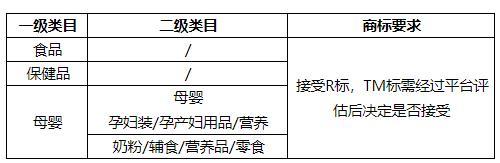 3、 各類目入駐品牌境內商標要求:(不在此表內的類目視為同時接受TM標和R標)