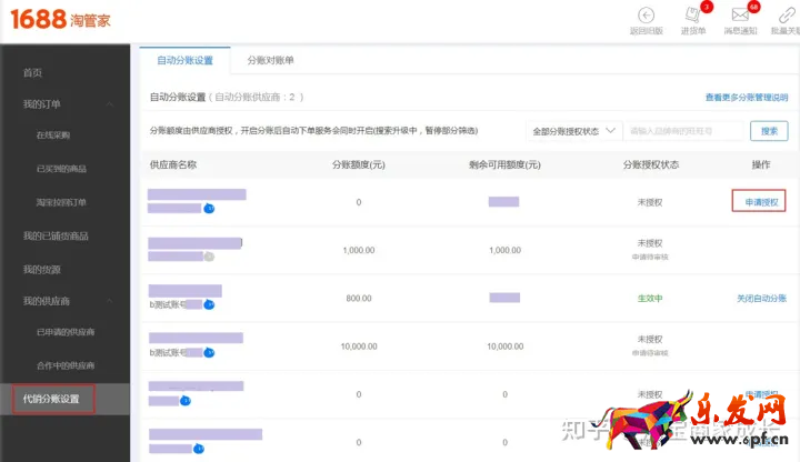 1.您登錄【1688分銷管理后臺】—【代銷分賬設置】自動分賬設置,可以選擇對應的供應商點擊“申請授權”—【快捷入口:點此查看圖文介紹】