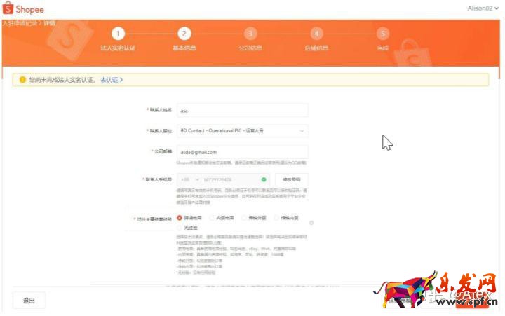 四個部分的信息需要提交:法人實名認證,聯系人信息,公司信息,店鋪信息