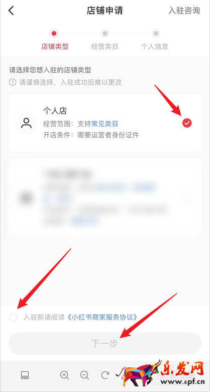 4 勾選【個人店】,有營業執照的可以點選個體工商戶店,閱讀商家服務協議后,點擊【下一步】