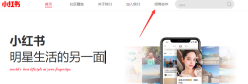 首先要進入到小紅書的官網,在百度里面搜索就好了,很簡單,然找到認證的官網。別進錯了哦。在這個官網里面的上方,各位親們可以看到招商合作,點擊就好了。