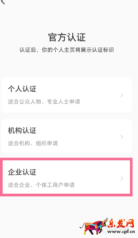 2 然后點擊【官方認證】選項,接著點擊【企業認證】。