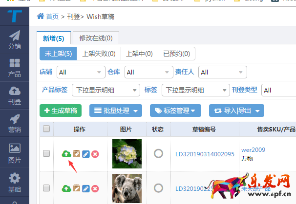 7、 生成草稿成功后,進(jìn)入刊登——Wish草稿,查看生成的草稿,點(diǎn)擊上架可以完成上架
