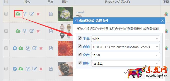 6、 回到產(chǎn)品——售賣產(chǎn)品資料界面,點(diǎn)擊“上架”,選擇您要上架的Wish店鋪,并且選擇您剛剛設(shè)置好的模板
