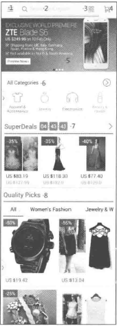 下圖為AliExpress Android客戶端的首頁設計,下面按照圖中標注的序號進行講解。