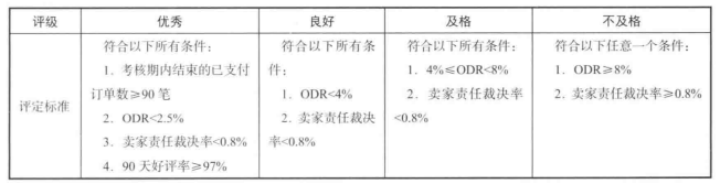 賣家服務等級在每月末評定一次,下個月3日之前在后臺更新,考核在過去90天內賣家的經營能力,包括買家不良體驗訂單率、賣家責任裁決率、好評率等。重點考核體現賣家交易及服務能力的一項新指標——買家不良體驗訂單率( Order Defect Rate,ODR ),即買家不良體驗訂單占所有考核訂單的比例。根據考核結果將賣家劃分為優秀、良好、及格和不及格4種等級,不同等級的賣家將獲得不同的平臺資源。