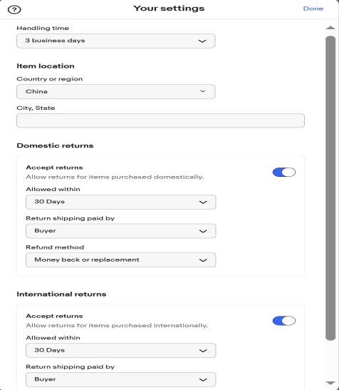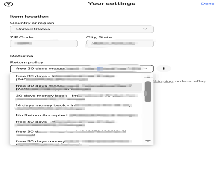 ★賣家也可以在商業(yè)政策中設(shè)置退貨政策模板,完成設(shè)置后,賣家在物品刊登創(chuàng)建的過(guò)程中便可直接根據(jù)模版中的退貨偏好進(jìn)行選擇。