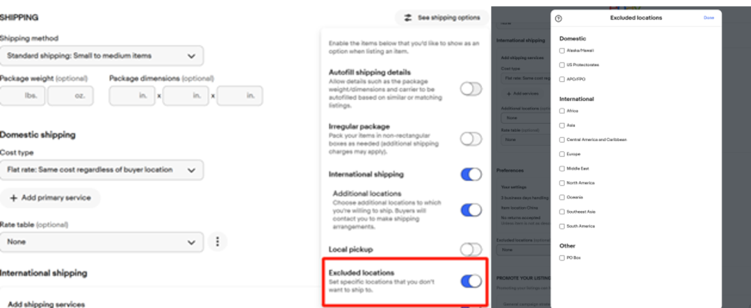 ntenteditable="false"/>需要特別注意的是,對(duì)于一些難以送貨的偏遠(yuǎn)地區(qū),或者賣家不希望發(fā)貨的地方,賣家可以通過(guò)設(shè)置屏蔽不發(fā)貨地區(qū)將這些地區(qū)屏蔽。賣家打開Excluded location后,在Preference下方就可以選擇屏蔽不發(fā)貨地區(qū)即可。
