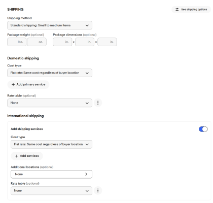 賣家需要根據(jù)物品的重量大小選擇不同的運(yùn)輸方式,這里需要注意準(zhǔn)確填寫好物品的重量、長(zhǎng)寬高的尺寸,方便后續(xù)核算物流成本。