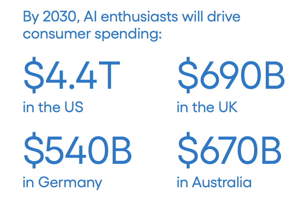 該研究還預測,到2030年,美國將有近一半(46%)的消費者支出受AI影響;在澳大利亞該比例將上升至55%,德國為46%,英國為39%。